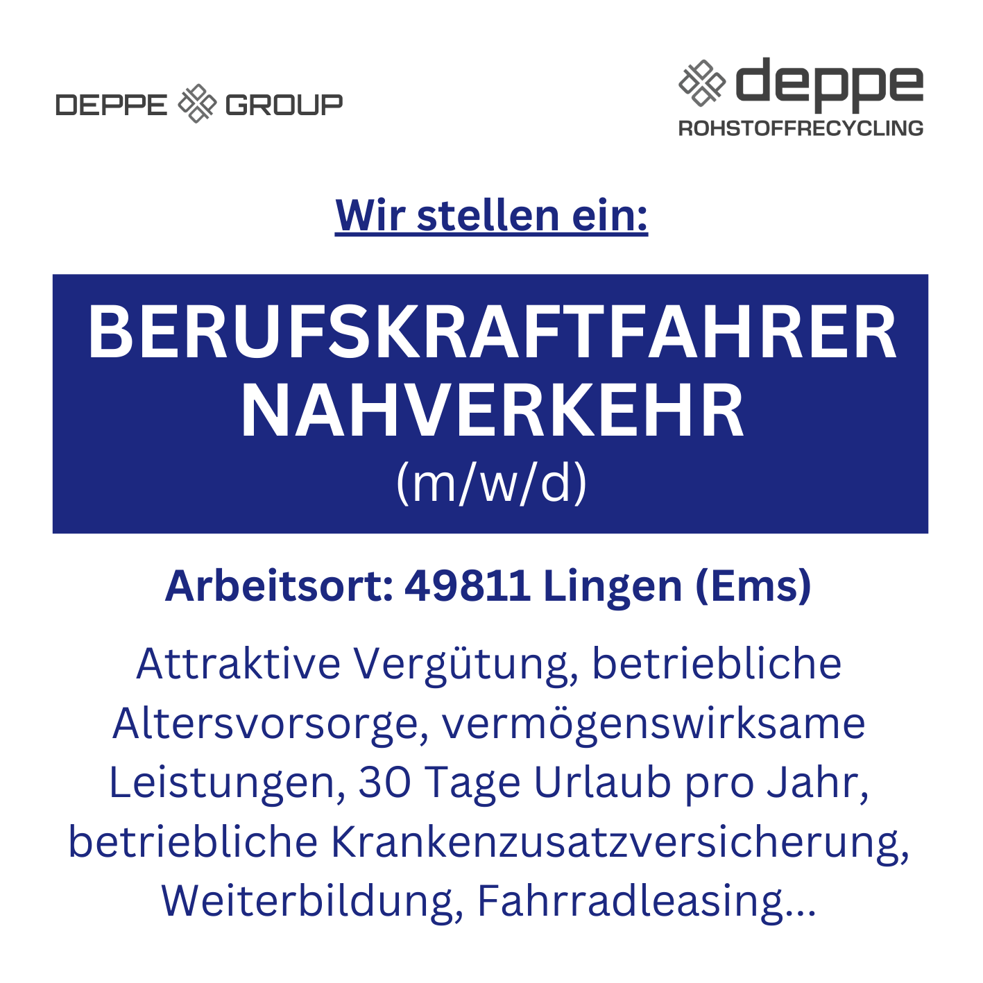 Die Deppe Rohstoffrecycling GmbH steht für Chancengleichheit und freut sich über Bewerbungen von Menschen aller Hintergründe.